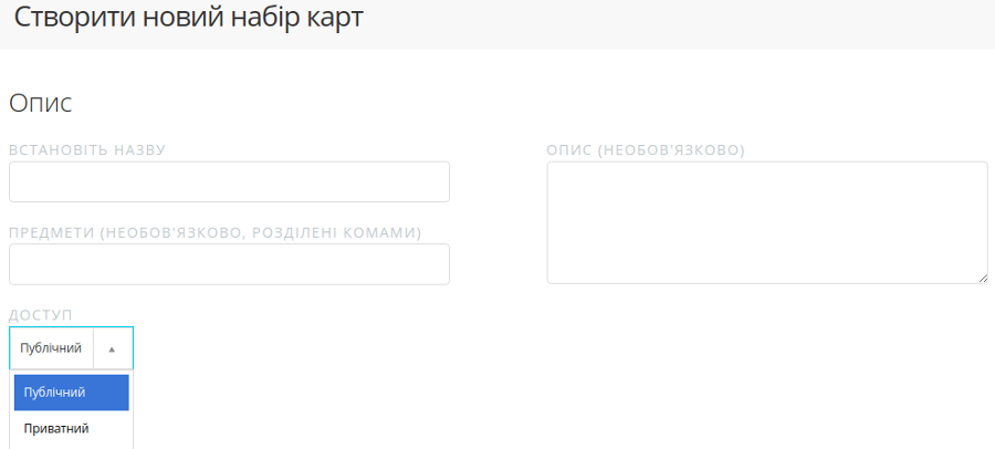 Першим етапом створення картки є задання теми, назви та опису. А ще ви можете обрати будуть ваші картки доступні всім чи тільки ви їх будете бачити. На наш погляд, корисна функція. В будь-який момент часу ви можете зробити свої картки загальнодоступними і так же легко приховати їх.