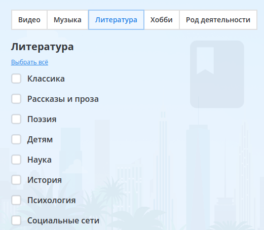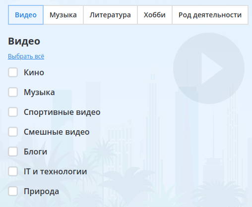 Сервіс пропонує вам відмітити потрібні (цікаві) для вас теми з різних сфер (кіно, музика, діяльність) та вказати рівень володіння англійською.