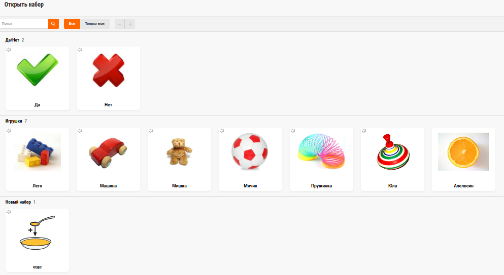 Во вкладке «Наборы» картинки размещены по категориям. Далее нужную категорию можно добавить в собственных наборов и выбирать только те изображения, которые вам нужно. Есть возможность изменять их с помощью интерактивной доски согласно вашим потребностям.